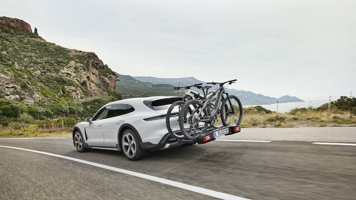Специально для Taycan Cross Turismo компания Porsche разработала задний кронштейн, который позволяет перевозить до трех велосипедов и впечатляет своей компактностью и удобством в повседневной эксплуатации. Кронштейн – универсальный и подходит для разных типов велосипедов. Инновационным в нем является то, что открыть крышку багажника можно даже при уже смонтированном и загруженном кронштейне.